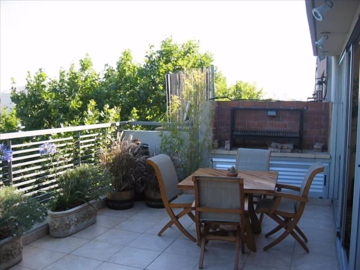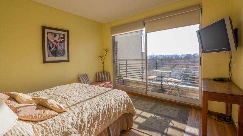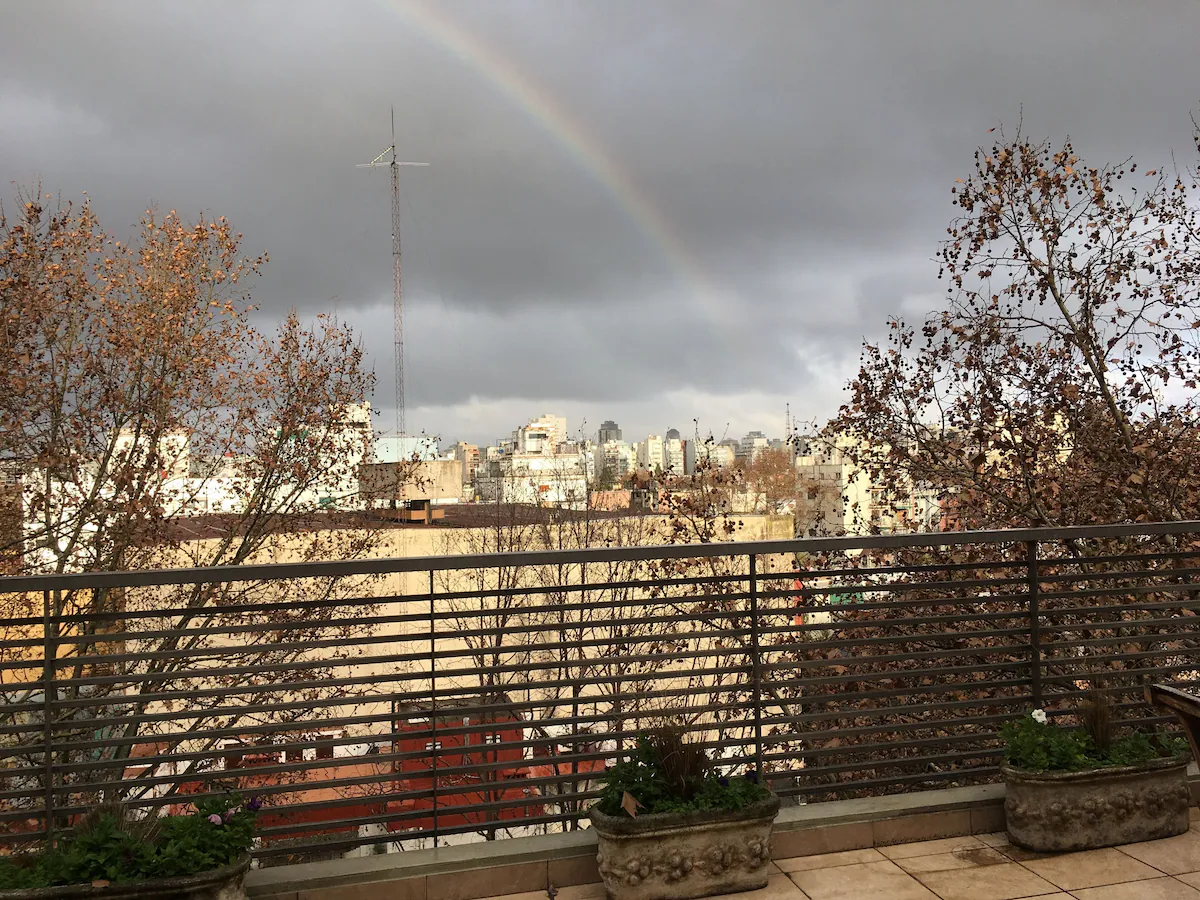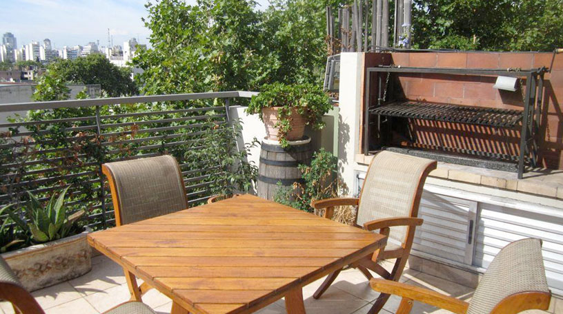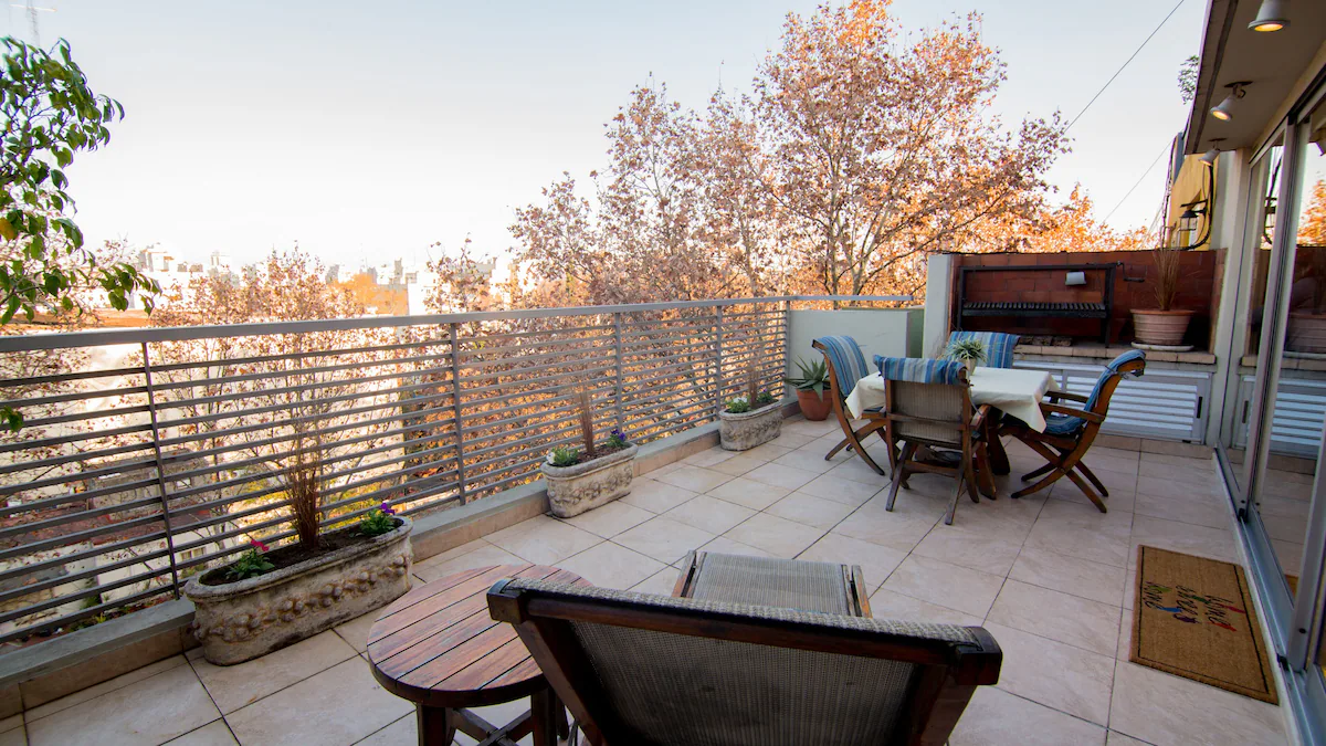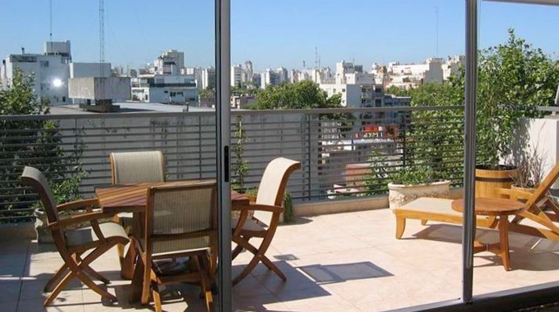 Penthouse Suite in the heart of trendy Palermo Soho. Located at Thames and Costa Rica Streets on 7th penthouse level above the traffic/noise. Outstanding views from both sides of the building on seventh floor overlooking beautiful Sycamore trees and the quaint streets of Soho. Two balconies, one facing East and one facing West. A lot of light and cross ventilation, in fact, the entire front side of the house is totally glass. In cool weather you get both sides of the house filled with natural heat. Large balcony is 32 m2 (350 SF). Condo is total of 95 m2 (1022 SF+/-) with 63 m2 (673 SF) interior. When comparing to alternatives, DON’T BE FOOLED: Most places are very tiny and not as large as this penthouse and usually only face one direction. Wonderful sunshine and peaceful setting.